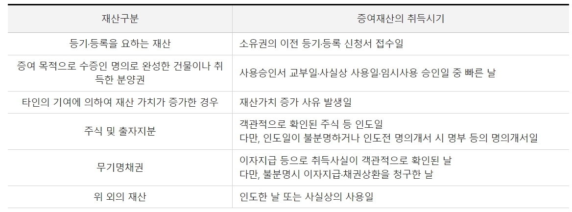 증여일로 보는 증여재산 유형별 취득시기는 다음과 같습니다.